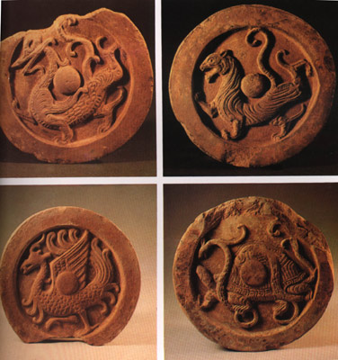 1956年西安汉长城遗址出土 四神由来颇早。远古时期,人们对许多自然现象不理解,以为有动物能呼风唤雨,主宰宇宙,心中产生崇拜,部落奉为图腾。商代,人们把天空四方的星象组成东方青龙、南方朱雀、西方白虎、北方玄武,以后作为方位或地域概念。到汉代,四神也被视为武力的象征,并出现在宫殿装饰瓦当及铜镜上。四神瓦当代表东西南北四个方位,又有驱邪除恶,镇宅吉祥的含义。其造型考究,体现了工匠们的高度智慧和艺术才情。